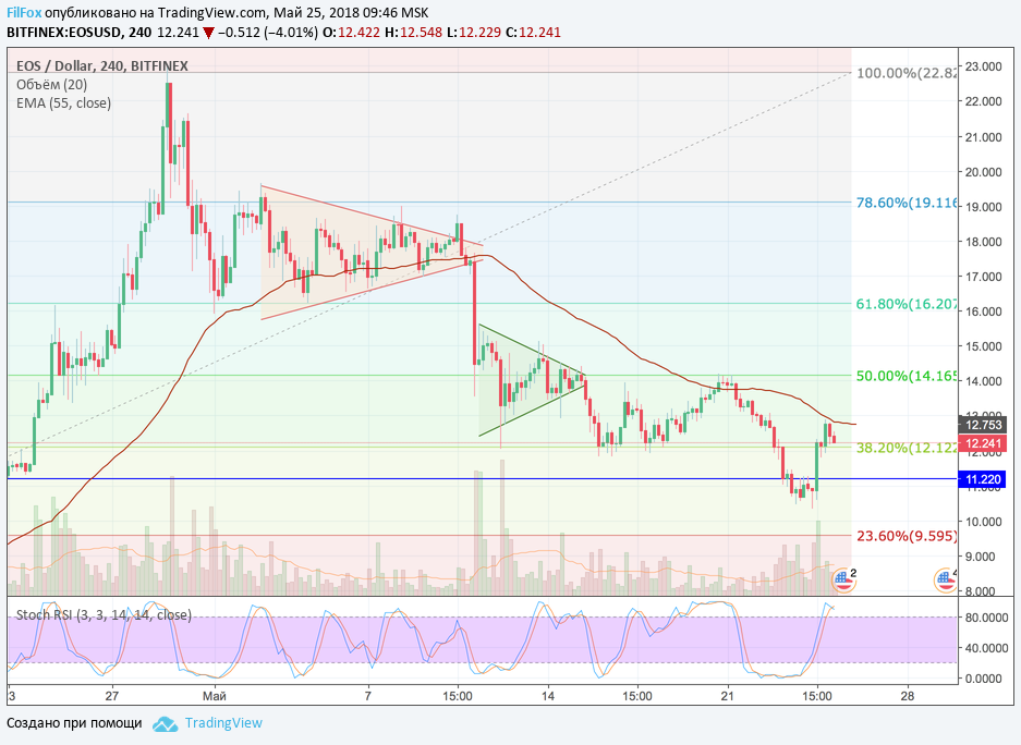 На четырёхчасовом тайм-фрэйме видно, как EOS закончил вчера восстанавливаться в районе средних цен закрытия, возле скользящей средней EMA55.