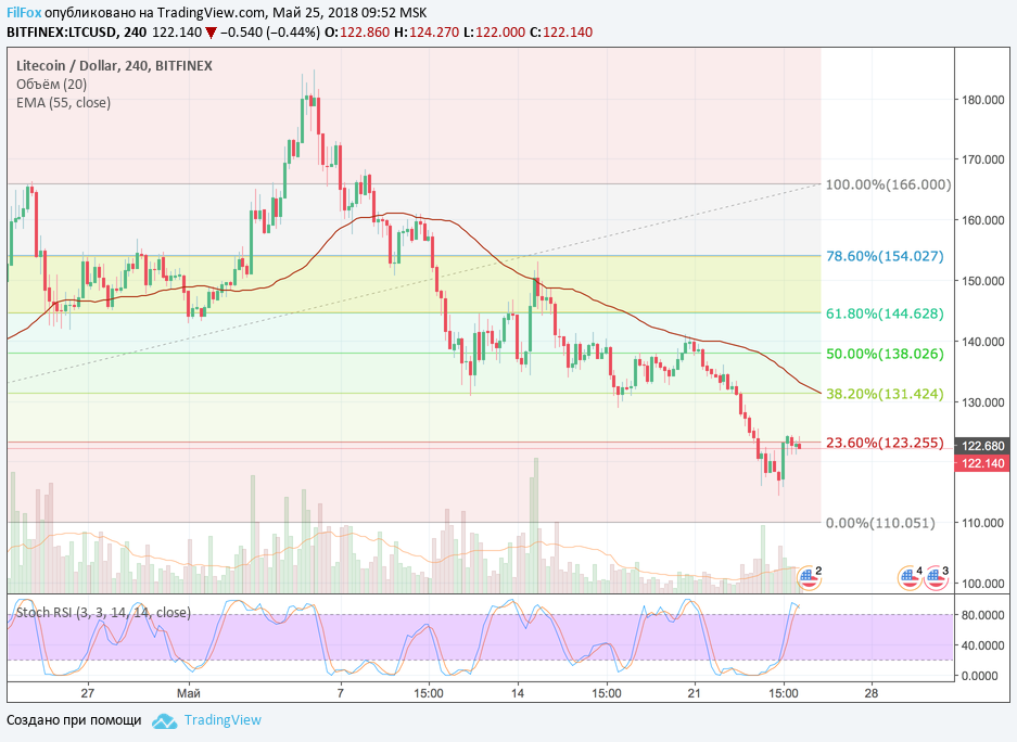 Восстанoвление Litecoin вчера закончилось на максимуме 124.45 USD. В этой точке, цена с разворота пробила уровень 23.6% фибо (123.00 USD) и направляется к нулевой поддержке фибоначчи 110.00 USD. Вполне возможно, что на отметке 112.00 USD существует линия обороны быков, которая не даст с ходу упасть на уровень 0% фибо (110.00 USD).