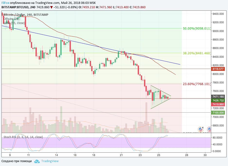 Несмотря на то, что уровень 7426.00 USD уже пробивался на фундаментальных новостях, он смог оказать достойную поддержку цене Bitcoin. Вчера, вдоль этого уровня поддержки, пара образовала сужающийся в треугольнике диапазон.