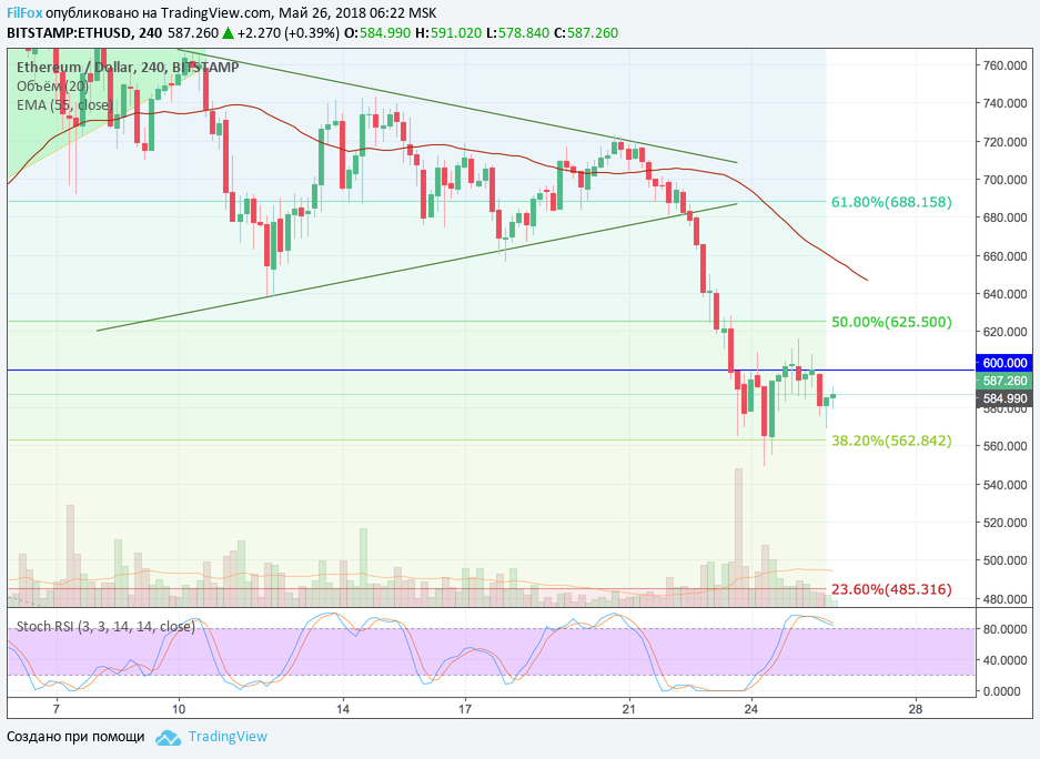 Вчера стохастик так и не сформировал внятный сигнал на снижение. При том, что индикатор уже находился в области перекупленности, Ethereum, каким-то образом, умудрился обновить дневной максимум на отметке 616.00 USD и сразу же упал под синюю линию 600.00 USD. Вокруг этой линии вчера «вращались» цены открытия и закрытия. И только к концу дня пара отправилась на ре-тест уровня 38.2% фибо (562.84 USD).
