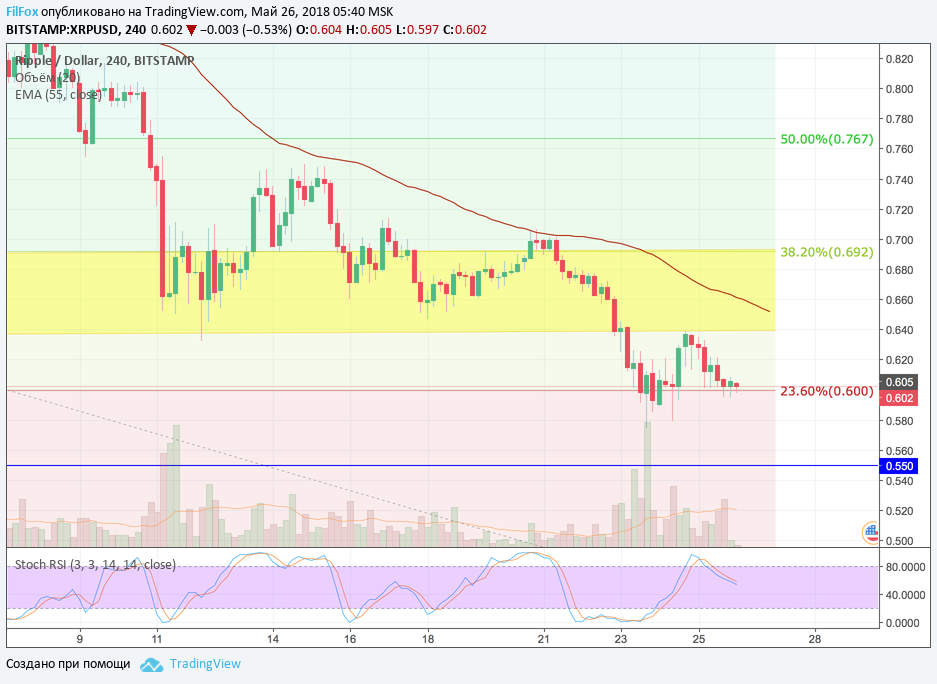 Ripple вчера целый день плавно снижался к уровню поддержки 23.6% фибо (0.600 USD). Несмотря на то, что он уже пробивался парой XRP/USD, в этот раз, уровень уверенно отбивал цену выше отметки 0.600 USD. Сегодня, после очередной попытки ре-теста, ожидается пробой этого уровня и продолжение снижения к целевой отметке 0.550 USD.