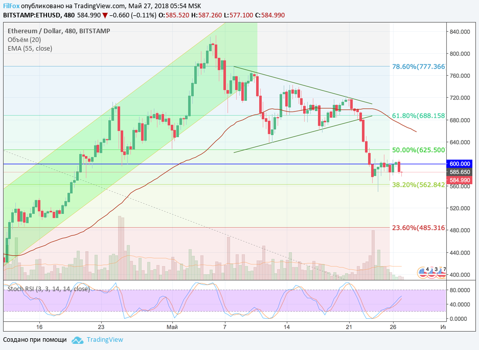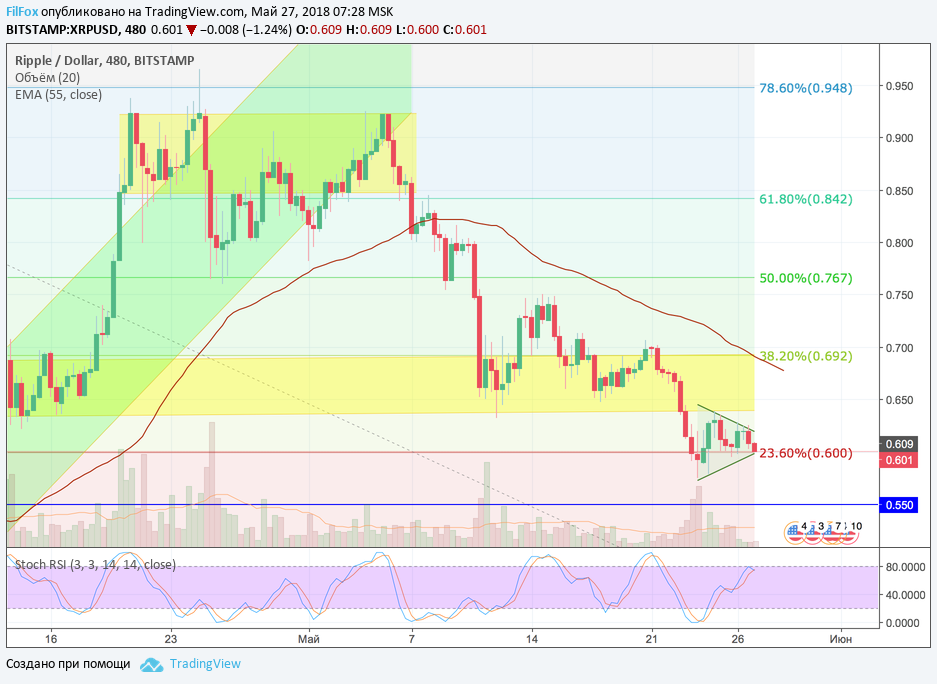 Ripple с начала недели упал с недельного максимума 0.700 USD до майского минимума 0.575 USD, потеряв при этом около 18%. Сейчас пара пытается консолидироваться над уровнем 23.6% фибо (0.600 USD) в сужающемся диапазоне.