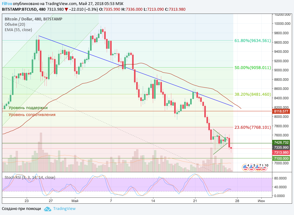 21 мая, на максимуме 8589.00 USD, закончилось восстановление цены после снижения, которое было на прошлой неделе. Таким образом в понедельник открылся новый «сезон скидок». За неделю цена Bitcoin сократилась почти на 15%, достигнув сегодня минимума. Вчера верхняя граница треугольника была пробита ложным бычьим импульсом и после локального максимума - 7622.00 USD, был достигнут недельный минимум 7213.00 USD.
