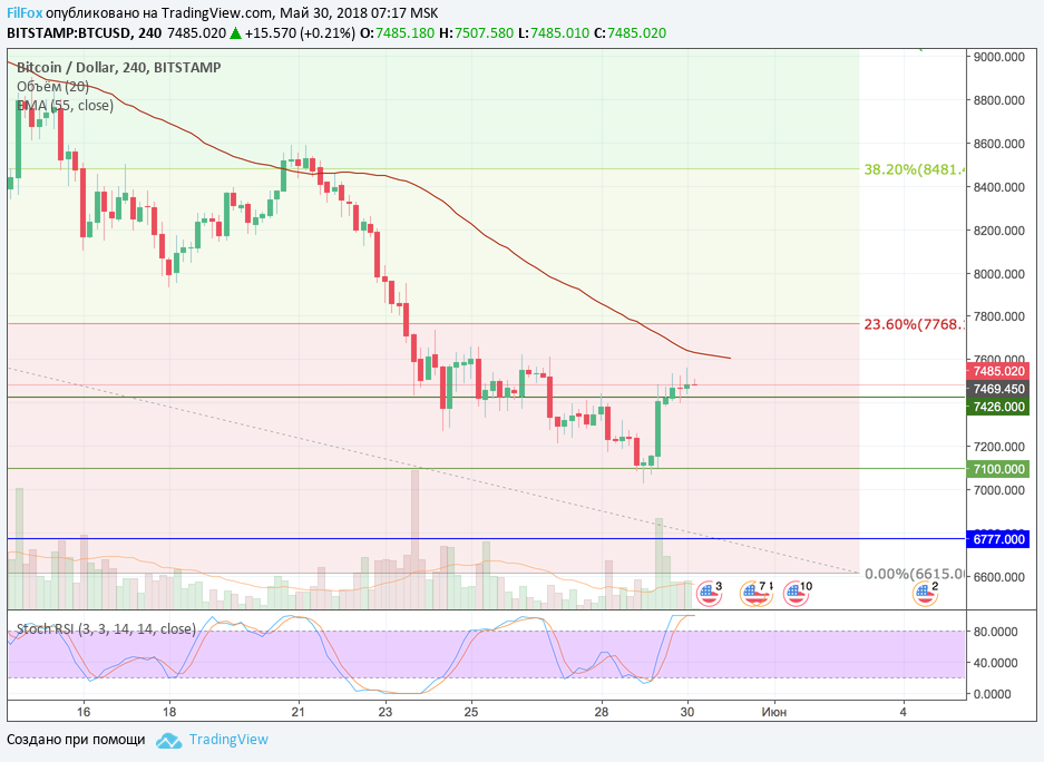 Вчера, после того как зелёная линия 7100.00 USD оказала поддержку цене Bitcoin, пара начала активно восстанавливаться к предыдущему уровню 7426.00 USD и в итоге установила дневной максимум на отметке 7537.00 USD. Сегодня этот максимум обновился до уровня 7559.00 USD, но, похоже, это всё, на что были способны быки, которые активными покупками, довольно большими объёмами, толкали вчера цену вверх.