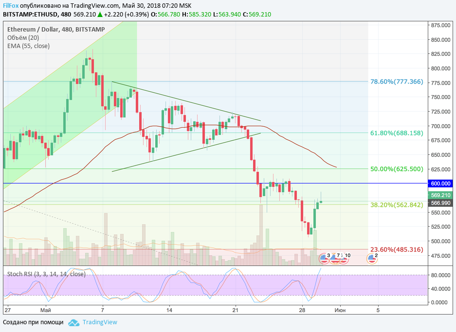 Вчера объёмы покупок, действительно, выросли и цена на волне позитива смогла восстановится выше уровня 38.2% фибо (562.84 USD). Пытаясь дотянуться до уровня цен 600.00 USD за эфир, пара установила дневной максимум на отметке 585.00 USD.