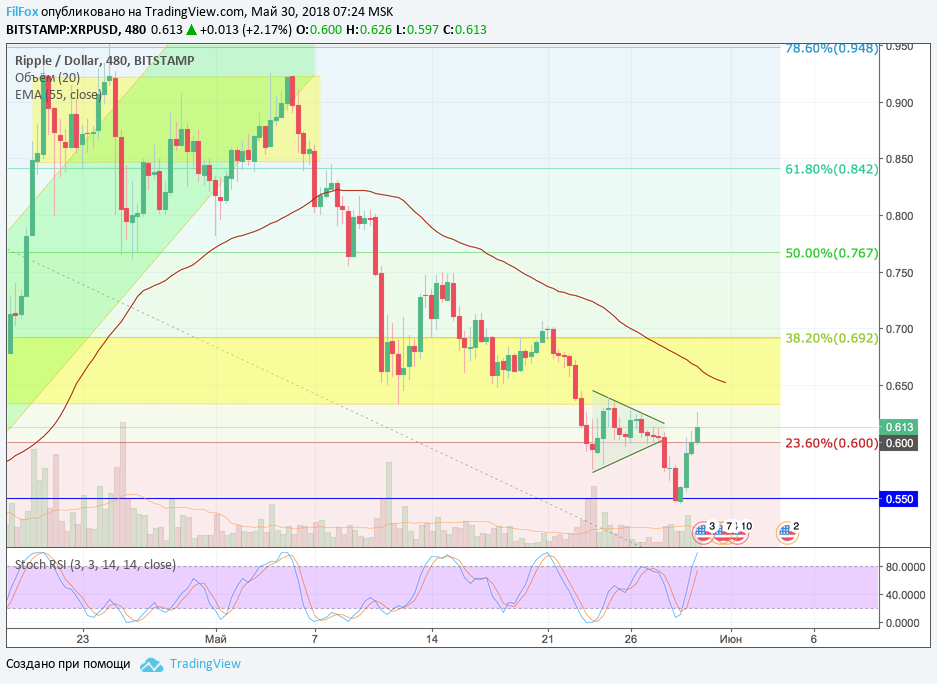 Глядя на динамичное восстановление пары BTC/USD, цена Ripple, нащупала поддержку на уровне 0.550 USD и тоже, весь вчерашний день, восстанавливалась. Пара XRP/USD без труда пробила сопротивление уровня 23.6% фибо (600.00 USD) и установила дневной максимум в области средних цен, на отметке 0.626 USD.