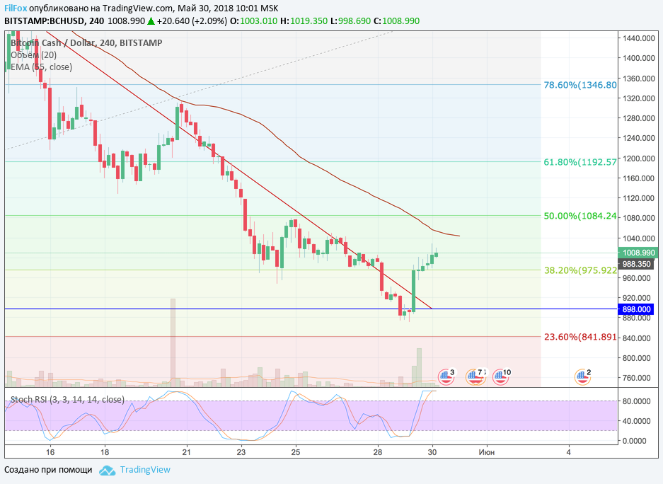 Вчера после минимума на отметке 870.00 USD, быки резко увеличили объёмы покупок и от уровня поддержки 898.00 USD, цена Bitcoin Cash резко выросла к уровню сопротивления 38.2% фибо (975.92 USD). Долго возиться с этим уровнем быкам не пришлось - цена преодолела сопротивление и установила дневной максимум чуть ниже уровня средних цен, на отметке 1028.00 USD.