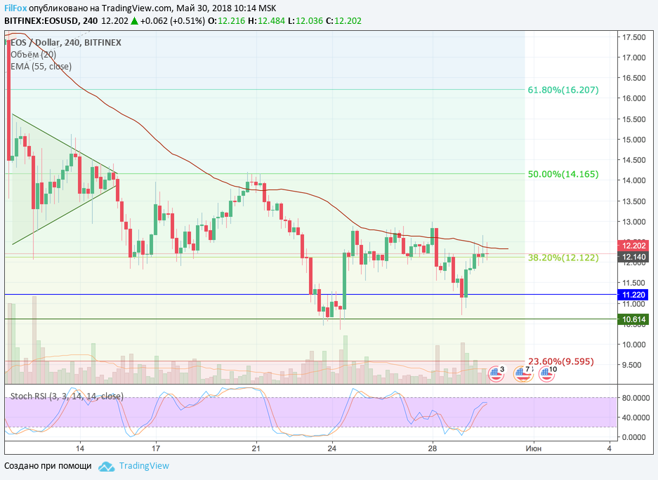 Вчера от минимума на отметке 10.70 USD, пара EOS/USD смогла восстановиться до уровня средних цен, обозначив максимум 12.65 долларов за токен. Сейчас цена откатилась к уровню поддержки 38.2% фибо (12.12 USD). Полагаем, что скользящая средняя EMA55 будет ограничивать дальнейший рост цены, удерживая пару в краткосрочной консолидации.