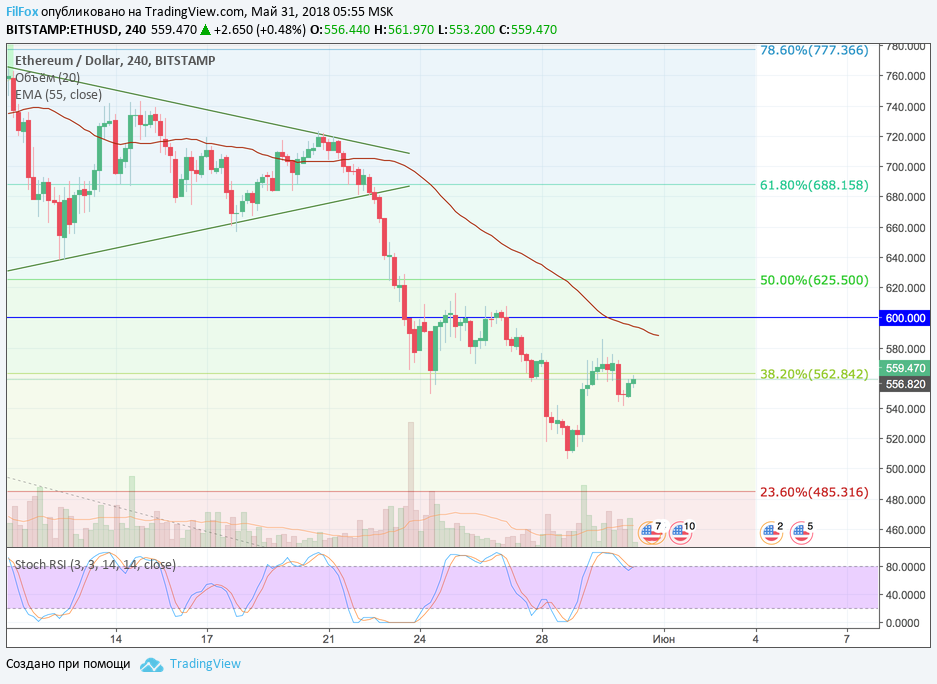 На четырёхчасовом графике область средних цен находится возле скользящей средней EMA55, около отметки 585.00 USD. Стохастик хоть и находится в зоне перекупленности, но на увеличенных объёмах рост ETH в эту область вполне возможен.