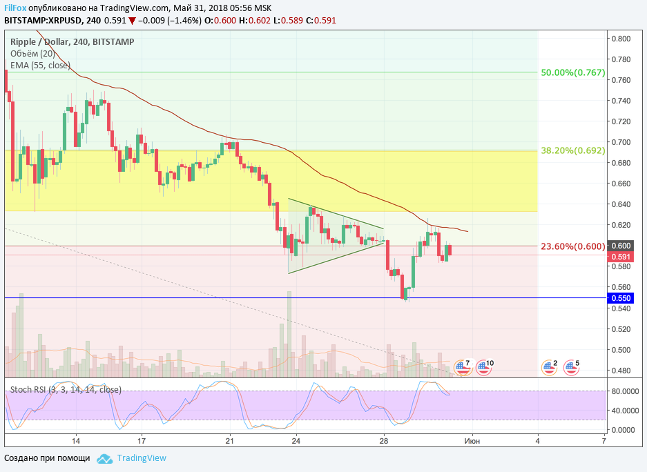 Ripple вчера не смог долго удерживаться выше отметки 0.600 USD и на снижении пробил этот уровень 23.6% фибо (0.600 USD), установив локальный минимум 0.583 USD. Объёмы покупок были ниже средних, но они позволили цене рипл восстановится на вчерашний уровень 0.600 USD. Сегодня наиболее вероятно выглядит ре-тест скользящей средней EMA55 и консолидация пары XRP/USD между поддержкой 23.6 фибо (0.600 USD) и уровнем средних цен.