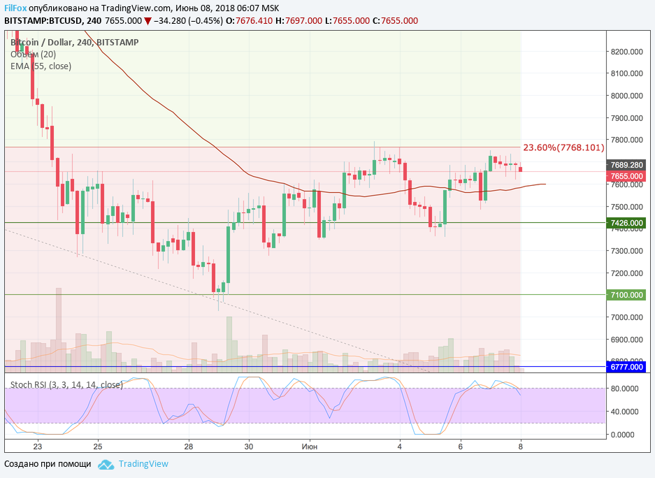 Похоже на то, что отсутствие ре-теста сопротивления 23.6% фибо (7768.00 USD) приведёт сегодня к падению цены Bitcoin до уровня поддержки 7426.00 USD. Стохастик на четырёхчасовом тайм-фрэйме ещё вчера днём подал сигнал на снижение, а на восьмичасовом графике этот сигнал сформировался примерно ночью.