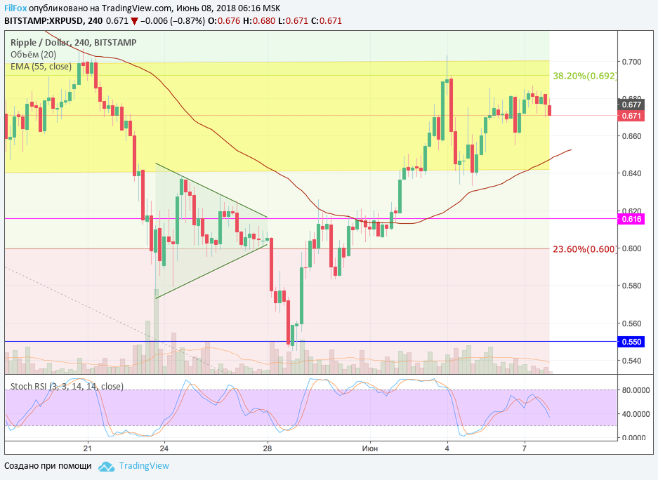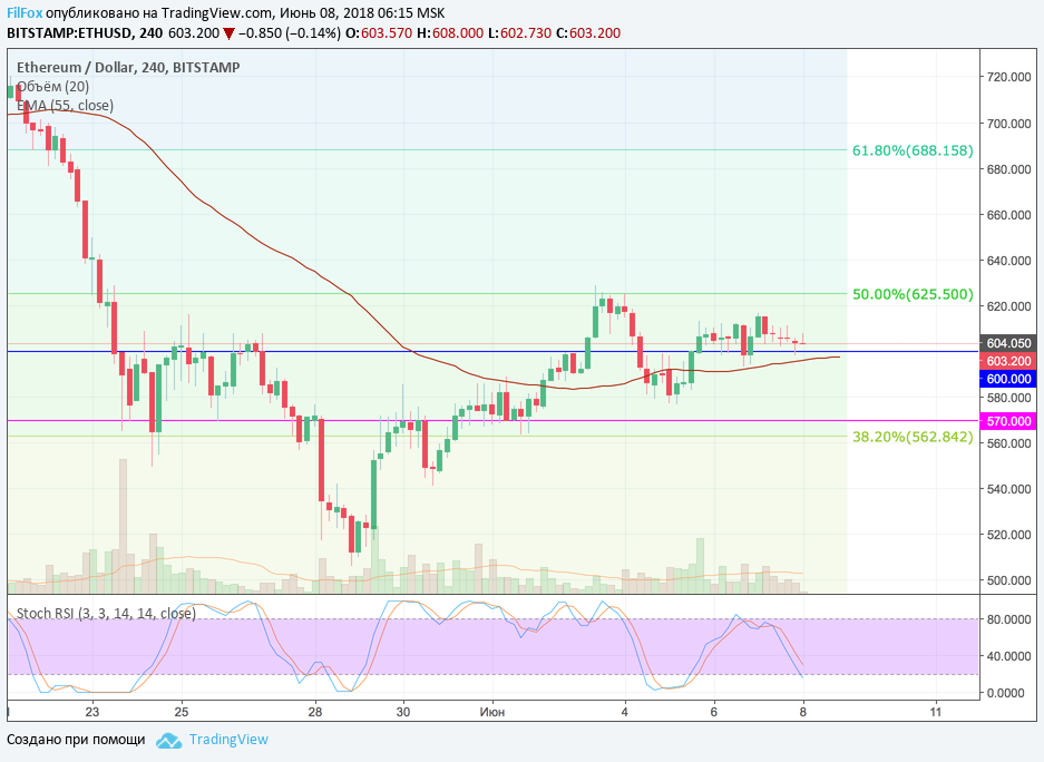 Индикатор стохастик подал вчера сигнал на снижение, когда на четырёхчасовом графике, Ethereum, после консолидации на уровне средних цен, начал снижение к психологической отметке 600.00 долларов за эфир. Если медведи сегодня продавят этот уровень, то цена упадёт в область поддержки 570.00 USD.