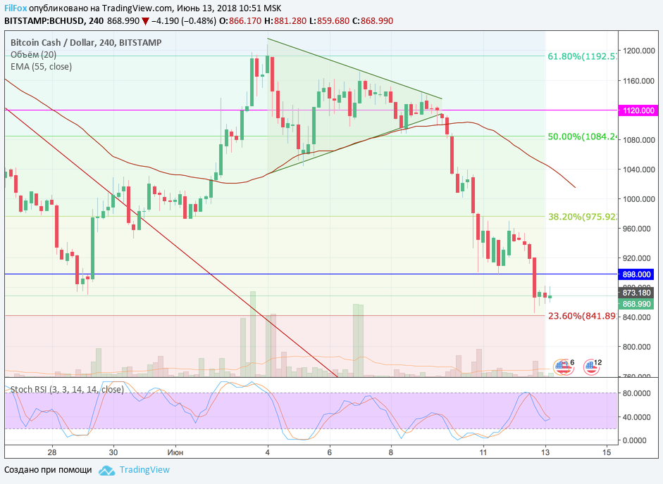 Вчера на восстановлении, пара BCH/USD пыталась дотянуться до сопротивления 38.2% фибо (975.92 USD), но криптовалютный флагман начал очередное погружение и повлёк за собой остальные альткоины. В результате Bitcoin Cash пробил уровень сопротивления 898.00 USD и установил минимум в точке 845.00 USD. Отскок и консолидация были в области 870.00 USD. Цена до сих пор стабилизируется на этой линии поддержки, пытаясь не очень резко переползти к следующему уровню фибоначчи 23.6% (841.89 USD), в надежде продолжить консолидацию.