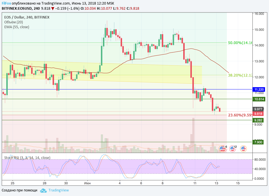 Вчера пара на снижении встретила поддержку на уровне 23.6% фибо (9.595 USD). Сегодня события развиваются по классике жанра: после отскока цена направилась ре-тестить этот уровень поддержки и скорее всего преодолеет его. Локальный минимум возможен в области 9.282 USD. К целевой отметке 7.900 USD пара будет двигаться более размеренными шагами.