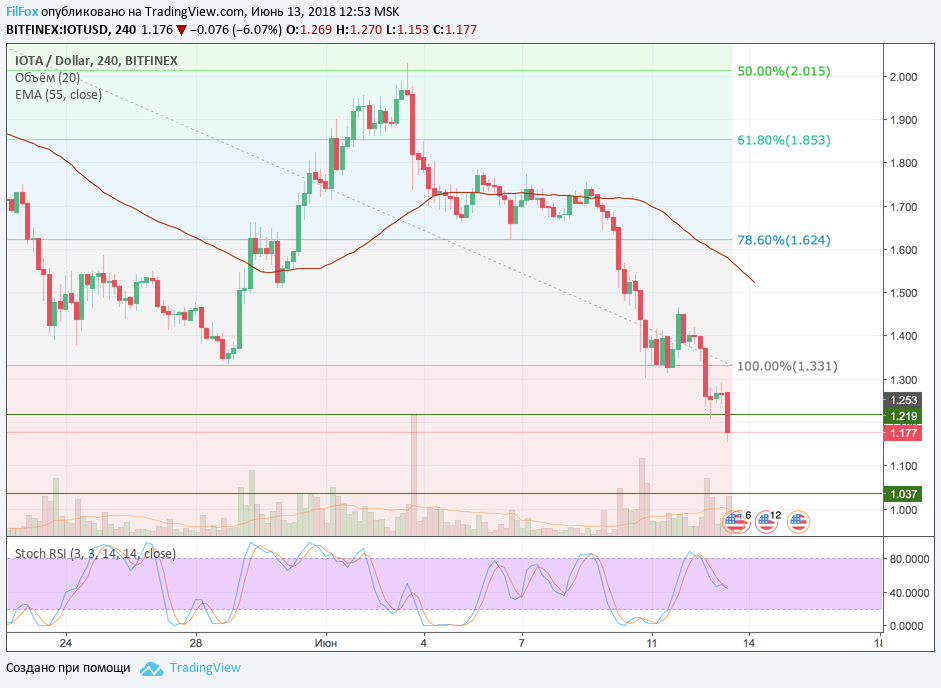 После прорыва поддержки 1.219 USD, пара может консолидироваться на уровне 1.100 USD. Если цена сегодня достигнет целевой отметки 1.037 USD, то скорее всего область 1.100 USD будет выбрана для восстановления пары IOTA/USD.
