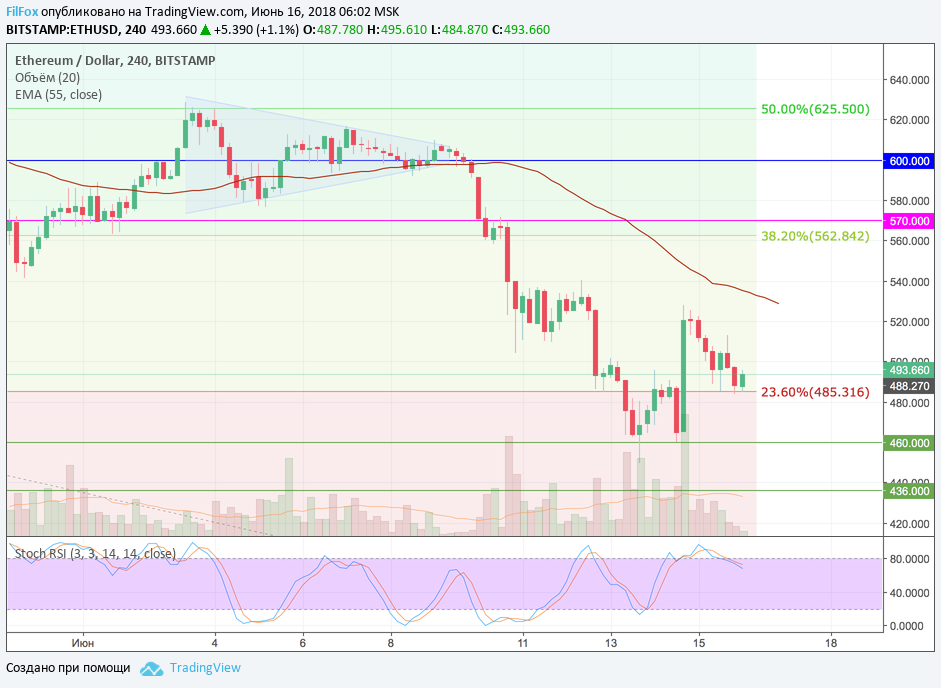 Заявление 14 июня, на саммите Yahoo Finance, директора по корпоративным финансам SEC Уильяма Хинмана, оставило свой след на ценовом графике пары ETH/USD в виде максимума на отметке 528.00 USD. Но такое впечатление, что азиатский рынок проигнорировал одиночную позитивную новость и сейчас пара опустилась к уровню поддержки 23.6% фибо (485.31 USD), пытаясь консолидироваться над эти уровнем.