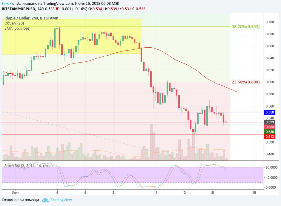 Как мы и предполагали, консолидация Ripple переместилась в широкий диапазон между синей линией $0.550 и красной - $0.513. И хотя цена сейчас снижается для ре-теста уровня 0.513 USD, присущая «нервозность» при стабилизации пары ещё не утрачена. Цена вполне может развернуться на уровне 0.530 USD и вернуться к верхней границе 0.550 USD.