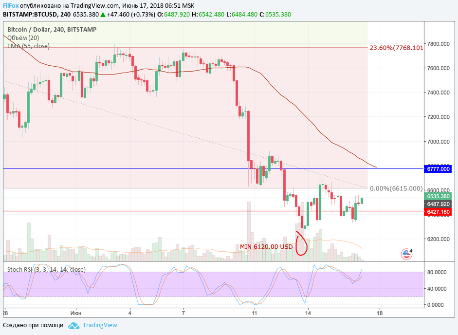 Восстановление цены проходило менее динамично, но заявление представителя SEC Уильяма Хинмана о том, что Bitcoin и Ethereum не являются ценными бумагами, немного всколыхнула унылый рынок и 14 июня пара BTC/USD восстановила свои позиции выше нулевого уровня фибоначчи (6615.00 USD). Правда, закрепиться в этой области цене так и не удалось и пара по сей день консолидируется, используя поддержку линии, проходящей через первоапрельский минимум - 6427.16 USD.