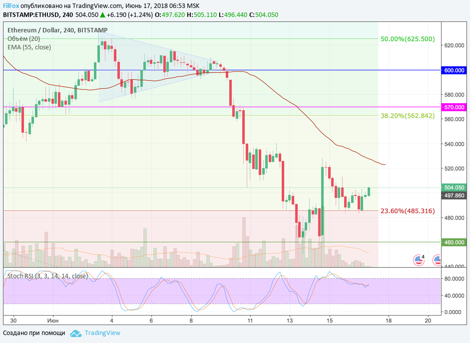 Динамика Ethereum, как всегда, очень сильно коррелировала с движением пары BTC/USD. 13 июня пара ETH/USD установила недельный минимум на отметке 449.65 USD, а после восстановления на фундаментальных новостях, отметилась на максимуме 528.00 USD. Консолидация проходит выше уровня поддержки 23.6% фибо (485.31 USD). Полагаем, что сегодня после ре-теста области 520.00 USD цена вновь спустится к поддержке уровня 23.6% фибоначчи (485.31 USD).