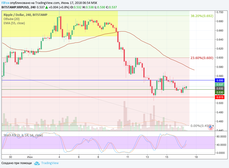 Не была особо индивидуальной и динамика Ripple. В среду, 13 июня, пара зафиксировала недельный минимум на отметке 0.504 USD, а на следующий день, после нервной консолидации в широком диапазоне, восстановилась до максимума в точке 0.569 USD. На текущий момент нервозность в динамике Ripple пропала и пара консолидируется в коридоре между синей линией $0.550 и красной - $0.513, вдоль уровня 0.530 USD. Сегодня консолидация в этом диапазоне продолжится.