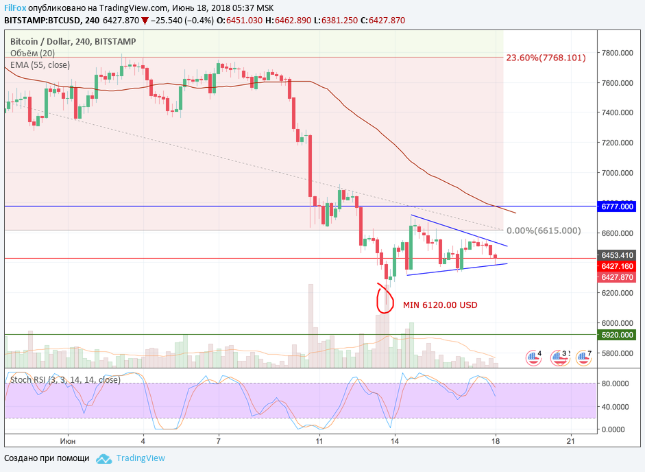 В точке максимума стохастик нарисовал сигнал на снижение и цена падает к нижней границе паттерна клин. На восьмичасовом тайм-фрэйме осцилятор, тоже, сигнализирует о снижении цены. Вполне вероятно, что в ближайшее время медвежий импульс проломит клиновидную фигуру и попробует дотянуться до ключевого уровня - февральского минимума 5920.72 USD, который пока является самой низкой точкой года.