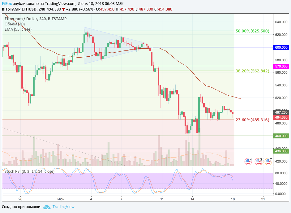 Вчера амплитуда колебания Ethereum начала затухать и вместо максимума в области 520.00 USD, цена отделалась скромными 510.00 USD. Дальнейшее снижение цены должно было закончится ре-тестом поддержки 23.6% фибо (485.31 USD). Сигнал стохастика на четырёхчасовом графике говорит о предстоящем ре-тесте в ближайшее время этого уровня. На более высоком тайм-фрэйме, сигнал на снижение только сформировался и, судя по всему, пара не просто проколет уровень поддержки, но, вполне вероятно, прорвёт его с целью ре-теста следующего уровня 436.00 USD.