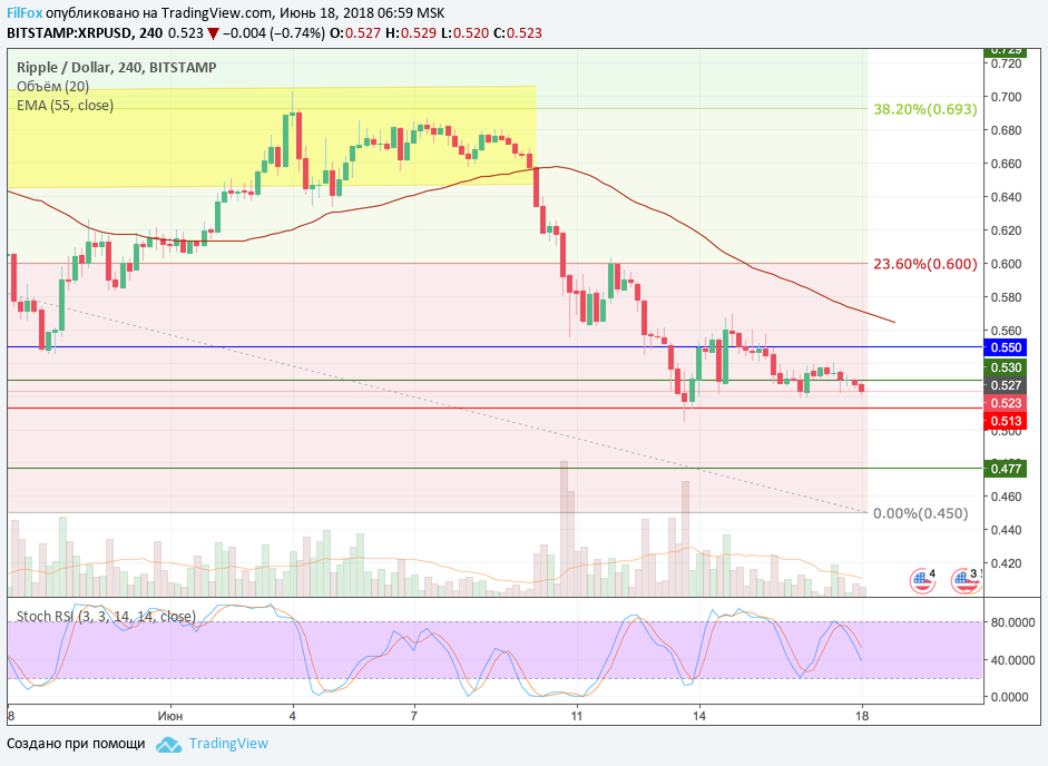 График цены Ripple, практически «растянулся» вдоль линии поддержки 0.530 USD, как сонная кошка. Вскоре ожидается медвежий импульс, который выведет цену из диапазона консолидации и отправит пару на встречу с нулевым уровнем фибоначчи (0.450 USD). Правда, протестировать этот уровень сразу не получится. Полагаем, что психологическая отметка 0.500 USD и поддержка 0.477 USD, будут мешать свободному падению цены и пытаться рассеять импульс в боковое направление.