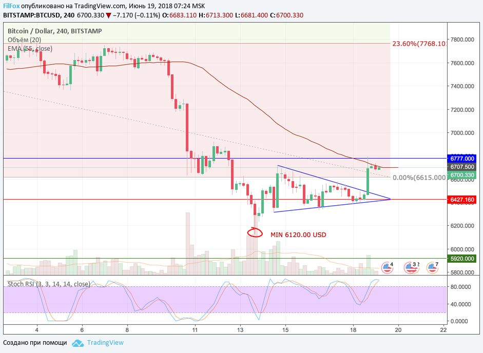 Если же после ре-теста верхней границы фигуры треугольника, цена сможет закрепиться выше уровня сопротивления 6777.00 USD, то возможен рост в область 7200.00 USD.