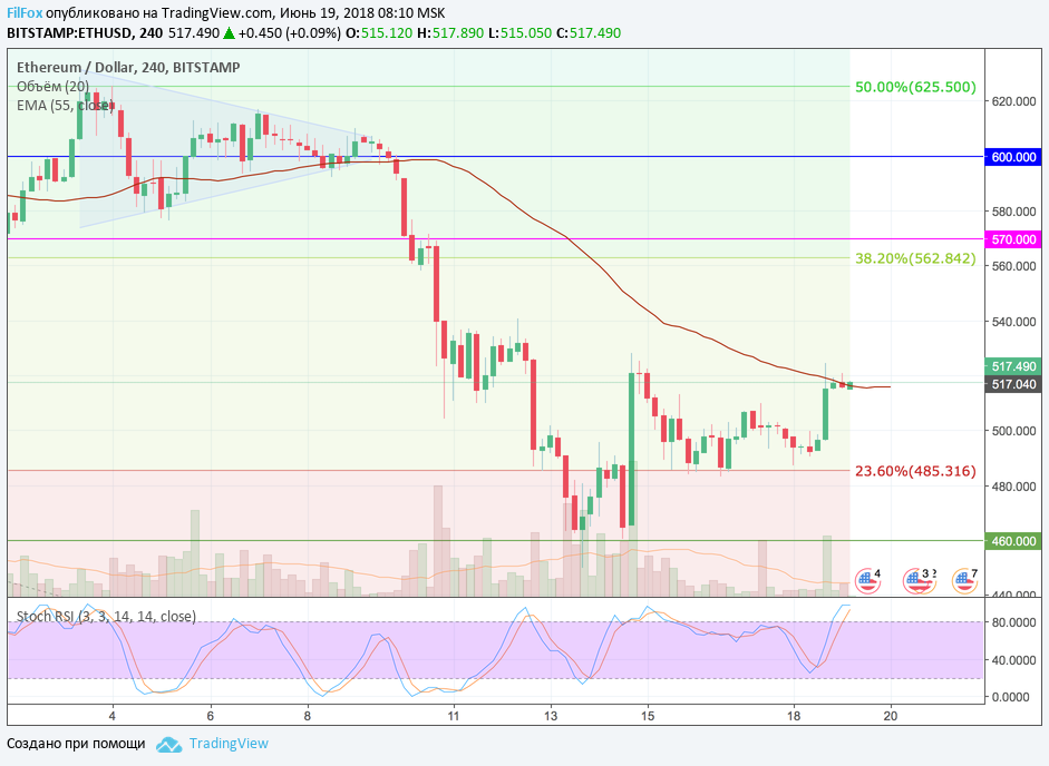 Если же, в области психологического уровня - «500 долларов за эфир», снижение остановится, и цена закрепится выше уровня средних цен, то возможен рост к уровню 38.2% фибо (562.84 USD). Этот сценарий считаем менее вероятным.