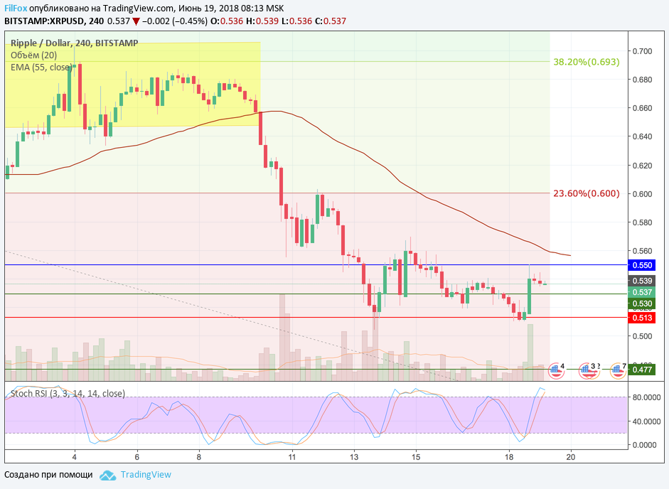 Вчера Ripple получил поддержку от нижней границы бокового диапазона 0.513 USD и протестировал верхнюю границу коридора боковика - уровень сопротивления 0.550 USD. Преодолеть его не удалось и пара снижается к равновесному уровню 0.530 USD, где долгое время стабилизировалась на прошлом уик-энде.