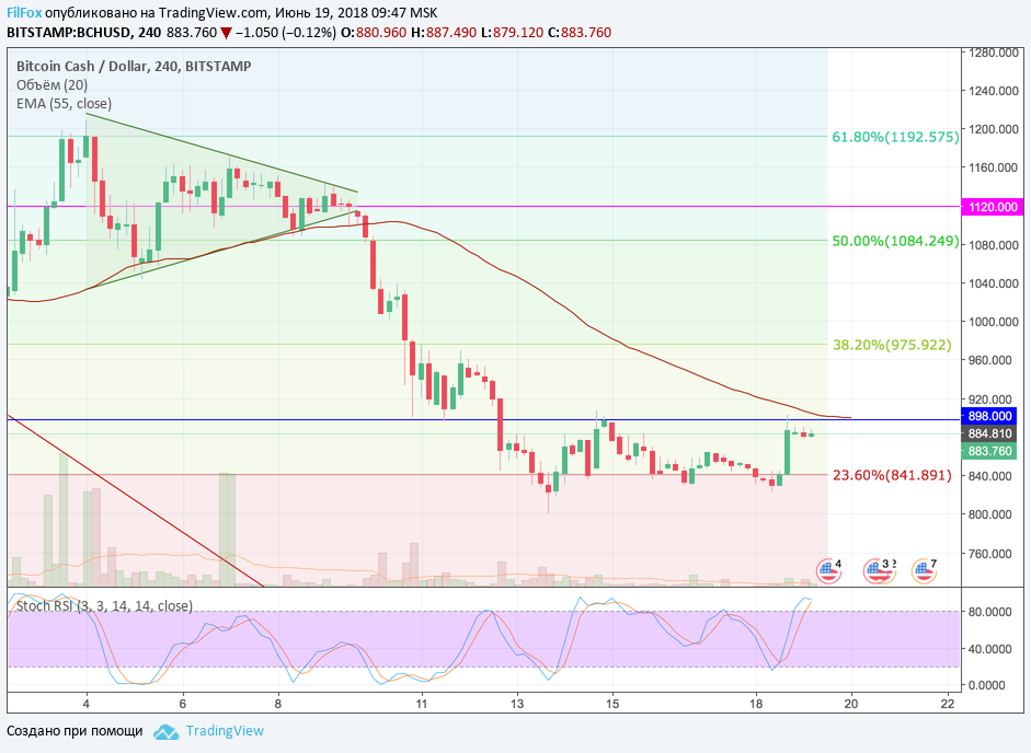 Вчерашний рост цены Bitcoin Cash проходил в рамках бокового диапазона консолидации. Протестировав верхнюю границу боковика, на уровне 898.00 USD, цена откатилась в пределы диапазона.