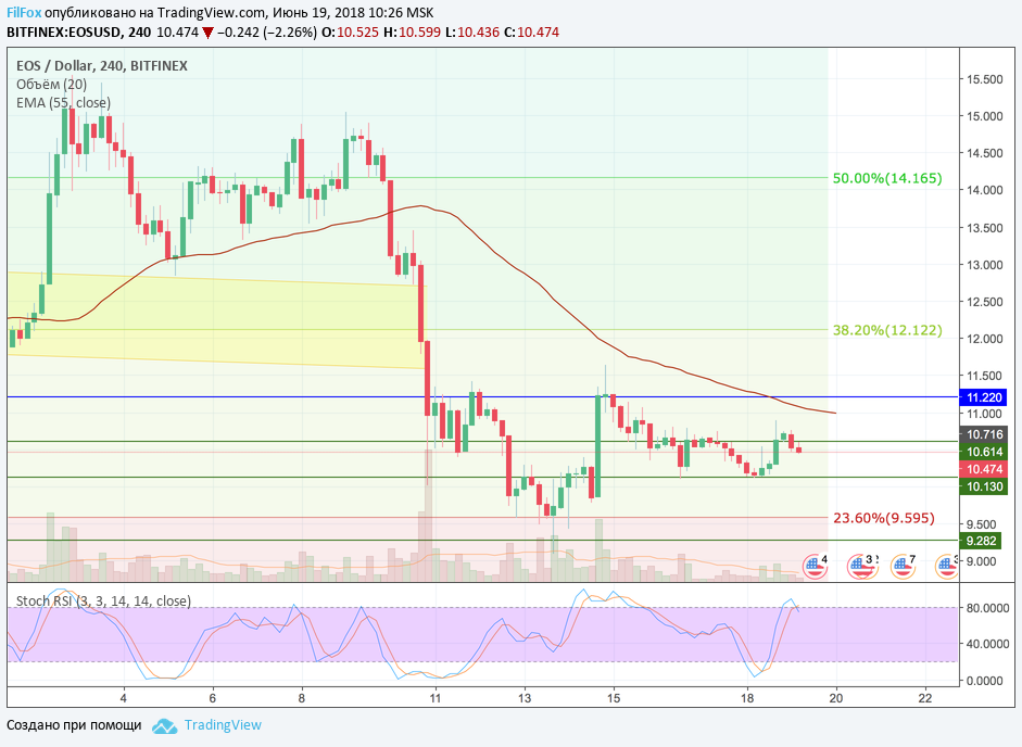 Вчера пара EOS/USD на восстановлении пробила уровень 10.61 USD и установила дневной максимум на отметке 10.90 USD. Однако долго удерживать цену выше сопротивления 10.61 USD, у быков пока не хватает сил. Цена пытается найти опору на уровне 10.13 USD. Если на этом, промежуточном уровне, снижение не остановится, то поддержку следует искать на более надёжном уровне 23.6% фибо (9.595 USD).