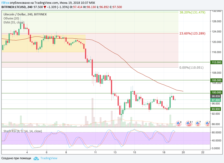 Как мы и предполагали, быки вчера не упустили возможность вернуть Litecoin на уровень 100 долларов за монету. Правда, закрепиться выше этого уровня, не удалось. Стохастик даёт сигнал на снижение и пара собирается откатываться к нижней границе бокового диапазона 93.93 USD.