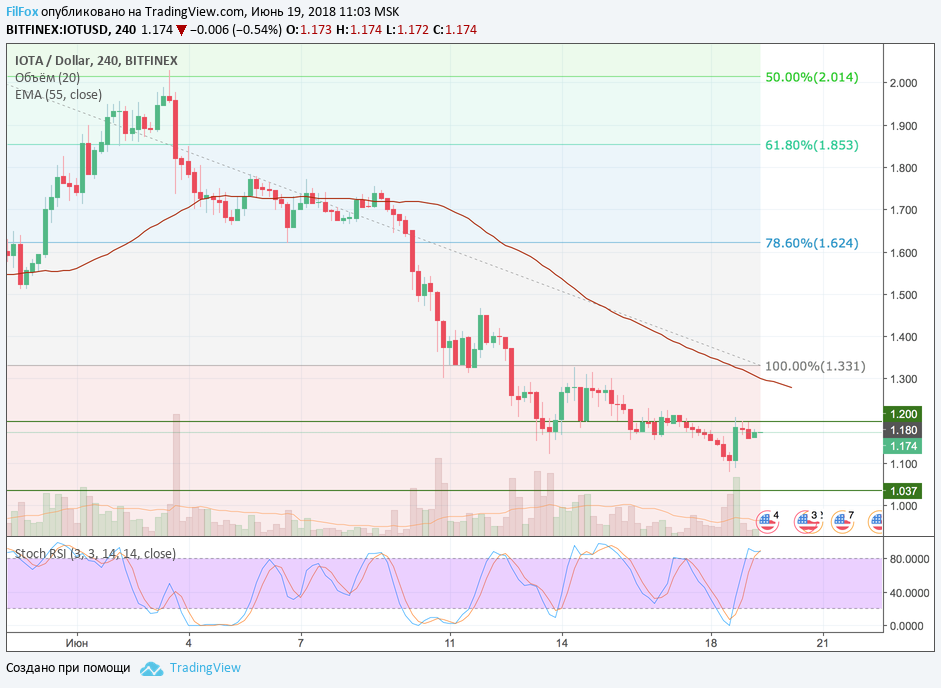 Вчера после минимума в точке 1.08 USD, пара восстановилась к верхней границе консолидации 1.20 USD. После нескольких неудачных попыток, IOTA упорно старается пробить сопротивление и закрепиться выше этого уровня. Если сегодня это получится, то закрытие дня будет в области средних цен EMA55. В противном случае июньский минимум может обновиться в районе 1.05 USD