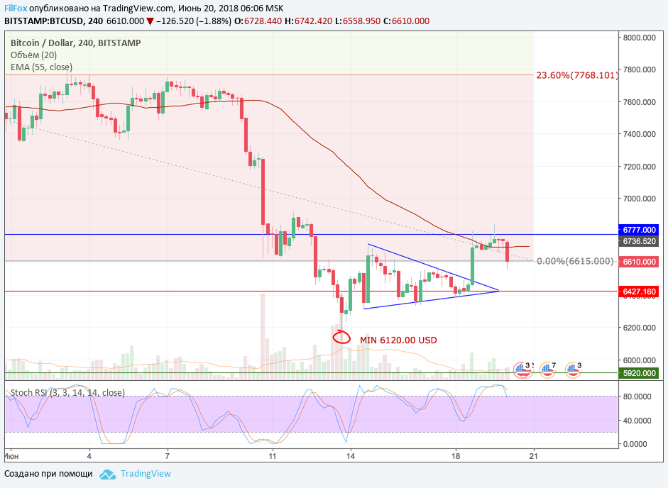 На восьмичасовом и четырёхчасовом тайм-фрэйме стохастик сформировал сигнал на снижение. Следует обратить внимание на динамику пары при прорыве нулевого уровня фибо. Если она будет затяжной, значит есть вероятность третьей (последней) попытки закрепиться выше уровня сопротивления 6777.00 USD. Если на рубеже поддержки 6615.00 USD быки быстро сдадут свои позиции, то необходимо дождаться ре-теста 6427.16 USD. Это разворотный уровень, который ещё способен реализовать маловероятный вчерашний вариант роста в область 7200.00 USD. Как мы уже говорили прорыв границы треугольника ниже этого уровня спровоцирует обновление годового минимума, который был установлен в феврале, на отметке 5920.72 USD.