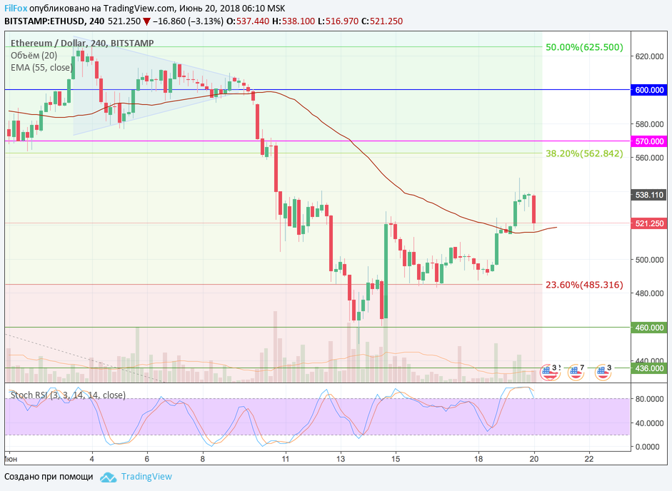 Вчера пара ETH/USD после непродолжительной консолидации на уровне средних цен, предприняла довольно дерзкую попытку ре-теста уровня сопротивления 38.2% фибо (562.84 USD). Кратковременный успех удалось зафиксировать на максимуме 547.82 USD, после чего цена поспешно вернулась в область средних цен, возле скользящей средней EMA55.