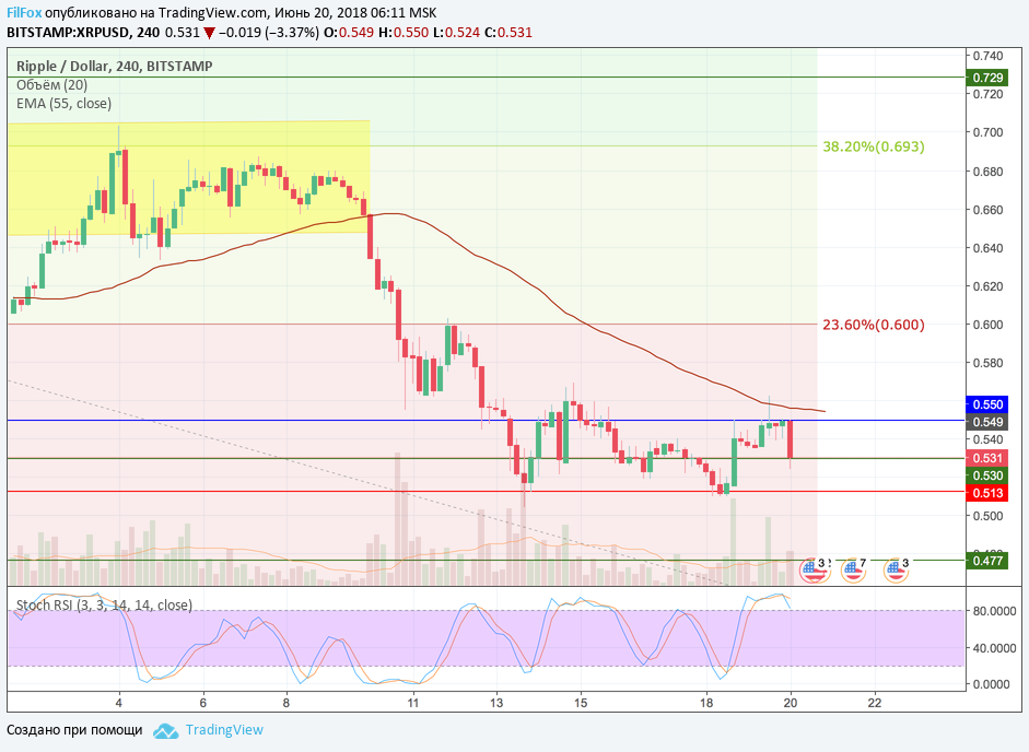 Вчера Ripple всё-таки организовал маловероятный сценарий прорыва верхней границы бокового диапазона 0.550 USD, но попытки закрепится выше скользящей средней EMA55, не увенчались успехом. Развернувшись в точке максимума 0.563 USD цена сразу откатилась под уровень сопротивления 0.550 USD. Сегодня цена уже упала посреди коридора боковика, возле равновесного уровня 0.530 USD. Судя по показаниям стохастика это только половина пути. Полагаем, что сегодня пара пробьёт нижнюю границу этого коридора 0.513 USD.