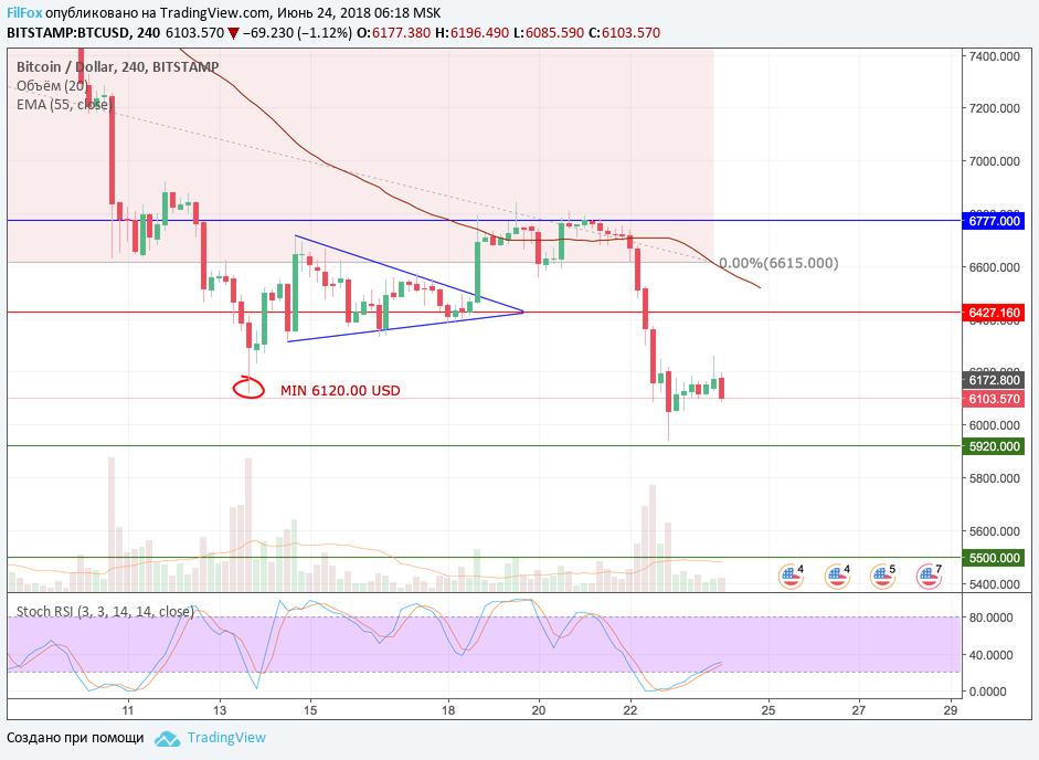 22 июня, вероломный медвежий импульс, проломил нижнюю границу прямоугольника и цена отправилась продолжать глобальный даун-тренд. В результате дневных распродаж, цена обновила июньский минимум, а вчера утром вплотную подобралась к годовому минимальному уровню 5920.72 USD. Нахрапом пробить февральское дно не получилось. Цена отскочила в область 6120.00 USD. Стохастик показывает сигнал на продажу, по-видимому, именно из этой области цена предпримет вторую попытку пробить дно. Полагаем, новый годовой минимум будет не слишком глубже февральского. Сегодня падение приостановится на уровне 5800.00 USD.