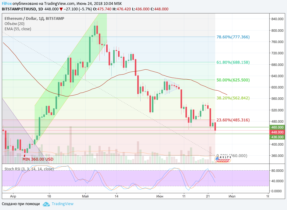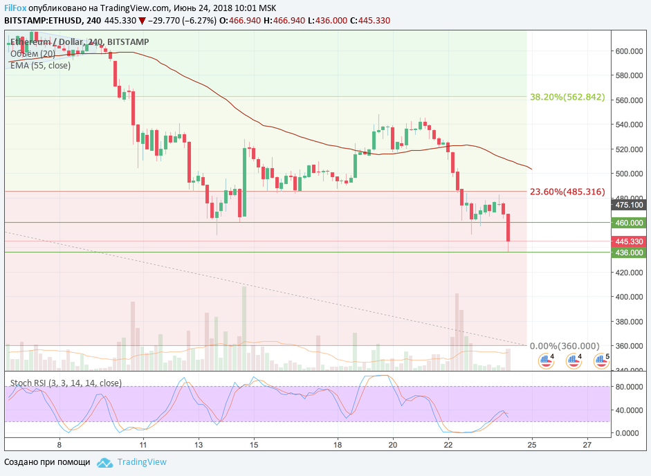 В отличии от пары BTC/USD, эфир ещё не обновил годовой минимум, который был установлен 1 апреля 2018 года на отметке 360.00 USD. Однако, глядя на стремительное падение цены на этой неделе, можно предположить, что скоро это событие ожидает и пару ETH/USD. Полагаем, что следующую неделю, пара будет начинать со снижения из области, ограниченной двумя зелёными линиями $460 и $436.