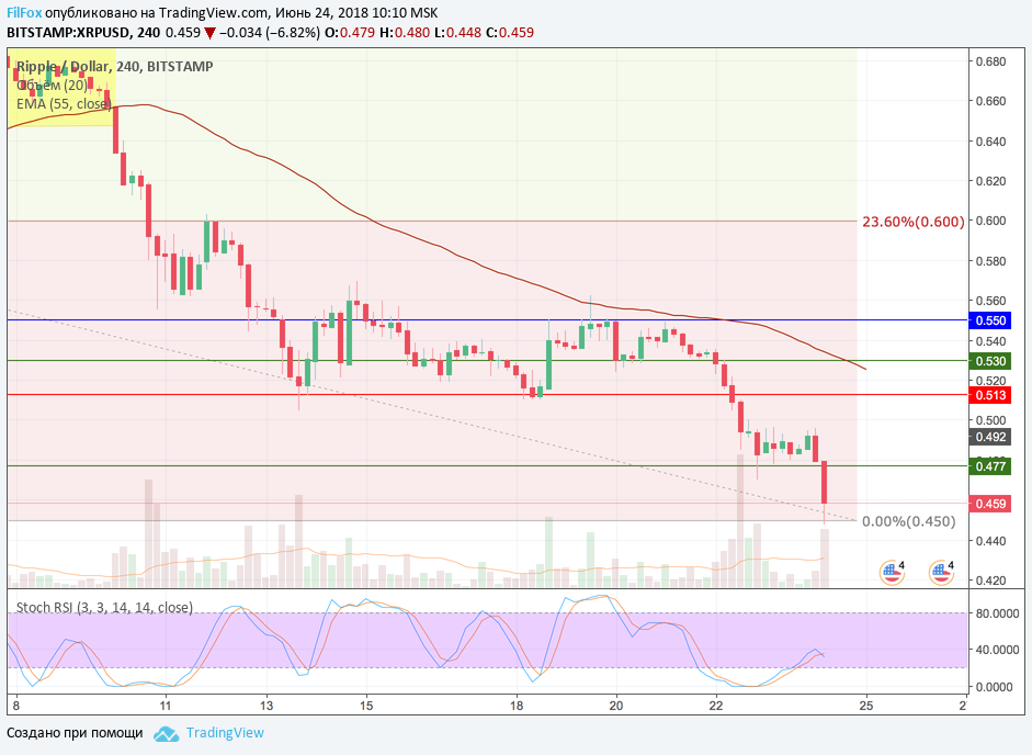 Для Ripple непреодолимым оказался уровень сопротивления 0.550 USD. Первую половину недели пара лениво лежала во флэте, используя поддержку уровня 0.530 USD, а медвежий импульс выдавил цену из боковика к нулевому уровню фибоначчи (0.450 USD). В точке 0.448 USD сегодня установлен новый годовой минимум Ripple.