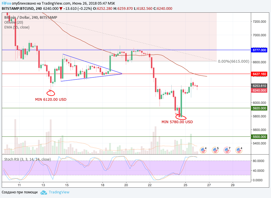 На восьмичасовом тайм-фрейме стохастик подошел к зоне перекупленности, но уже намечается формирование сигнала на снижение. Вопрос будет ли ре-тест области средних цен, обозначенной скользящей средней EMA55, пока остаётся открытым. Консолидация цены Bitcoin возле отметки 6250.00 USD, вполне может закончится резким снижением к поддержке 5920.00 USD и продолжением боковика уже над этим уровнем.