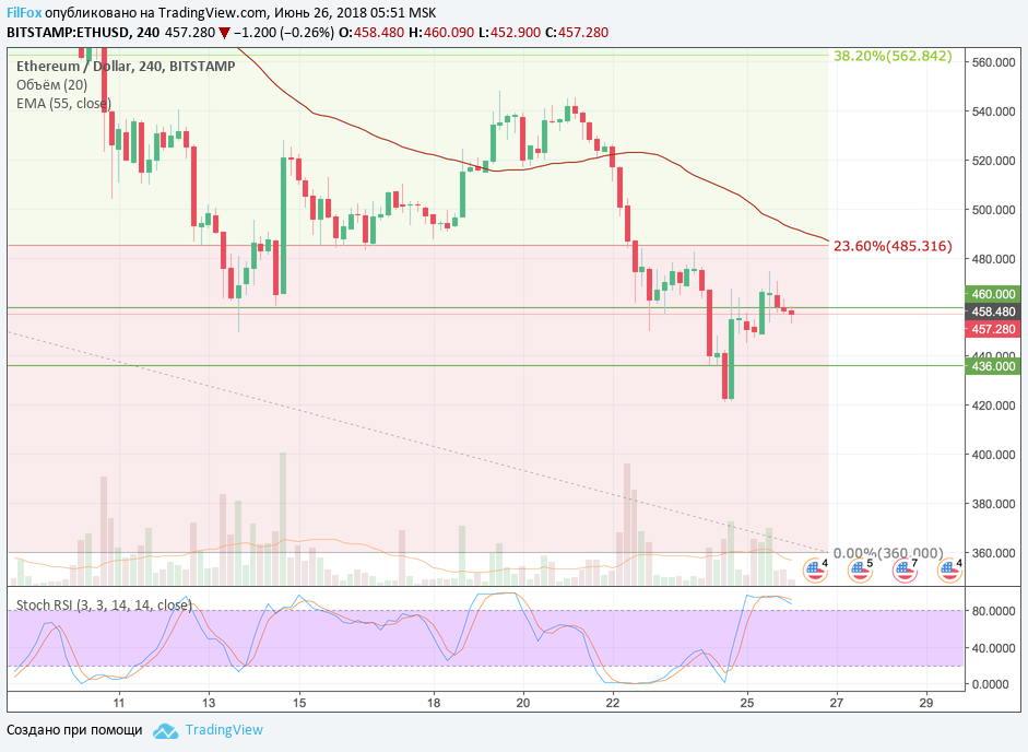Вчерашнее восстановление Ethereum закончилось дневным максимумом на отметке 474.69 USD. Сейчас пара консолидируется возле уровня поддержки 460.00 USD. На восьмичасовом графике стохастик находится в нейтральной зоне, ожидая продолжения восстановления. Если сегодня восстановление продолжится, то цена протестирует сопротивление 23.6% фибо (485.31 USD).