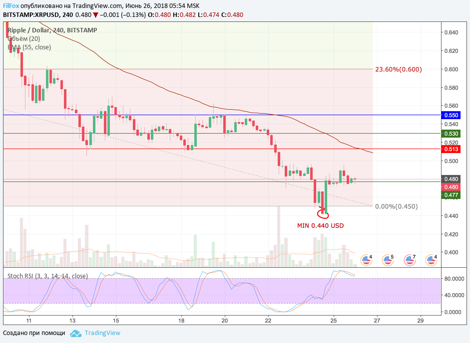 В данный момент цена вновь пришла к уровню поддержки 0.477 USD, где консолидируется в очень узком диапазоне. Если медвежье давление возобновится, то пара не успеет протестировать психологический уровень 0,50 USD за монету и упадёт к нулевому уровню фибоначчи 0.450 USD.