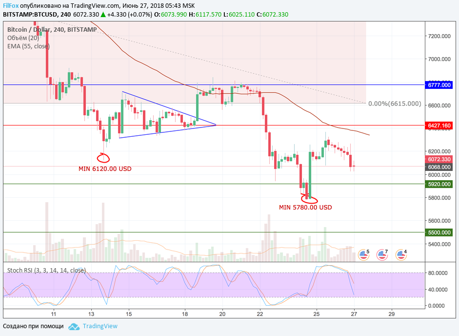 Стохастик показывает, что цена может просесть ещё ниже, примерно к поддержке 5920.00 USD. Полагаем, что сразу продавить ниже этого уровня поддержки не получится и от него цена отскочит в область предполагаемой коррекции. В нашем вчерашнем прогнозе мы определили её на уровне 6427.16 USD.