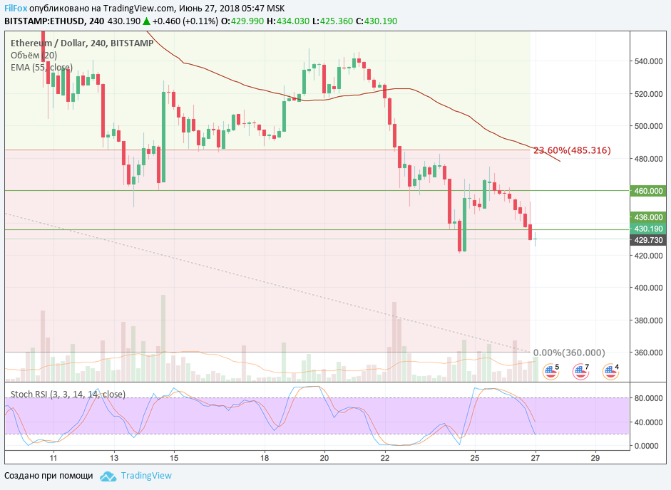 Вчера на четырёхчасовом тайм-фрейме стохастик сформировал сигнал на снижение. В течение дня цена Ethereum падала, пока не достигла поддержки на уровне 436.00 USD. Сегодня эта поддержка уже пробита и пара продолжает снижение. Полагаем, что оно ограничится психологической отметкой 400.00 USD и цена начнёт восстанавливаться к верхней границе коридора 460.00 USD.