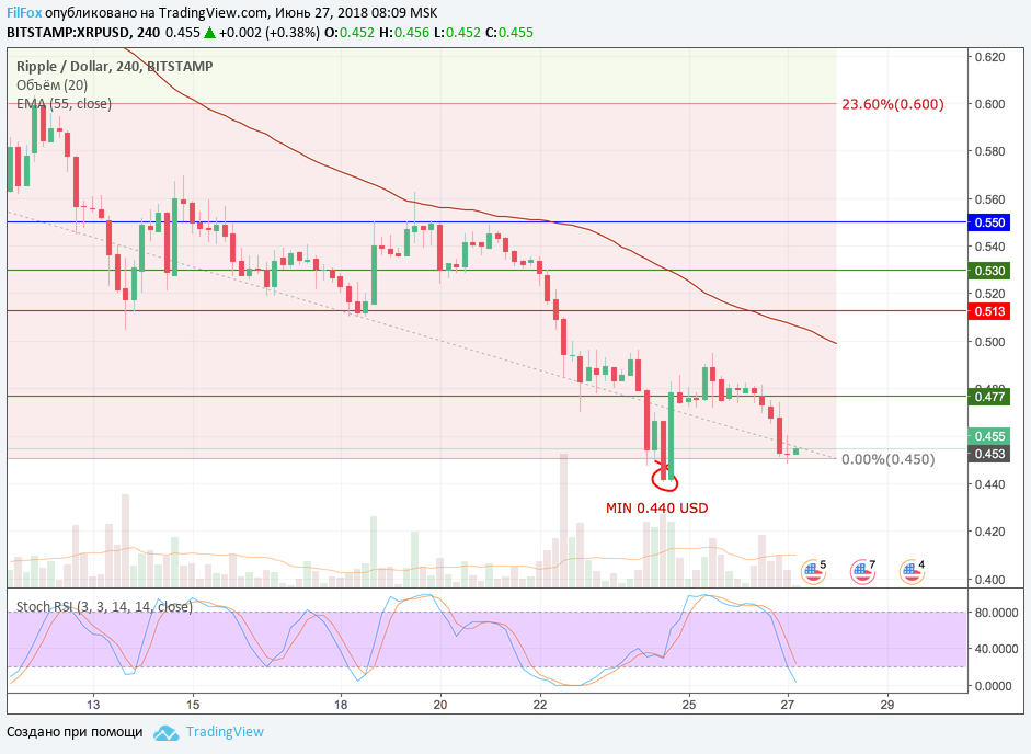 Вчера Ripple не смог протестировать психологический уровень «50 центов». Цена пары сорвалась с равновесной линии 0.477 USD и упала на нулевой уровень фибоначчи (0.450 USD). Сегодня этот уровень способен развернуть цену на восстановление. Вполне возможно, что в ближайшее время рипл ещё вернётся в область скользящей средняя EMA55, которая как раз проходит на уровне 0.50 USD.