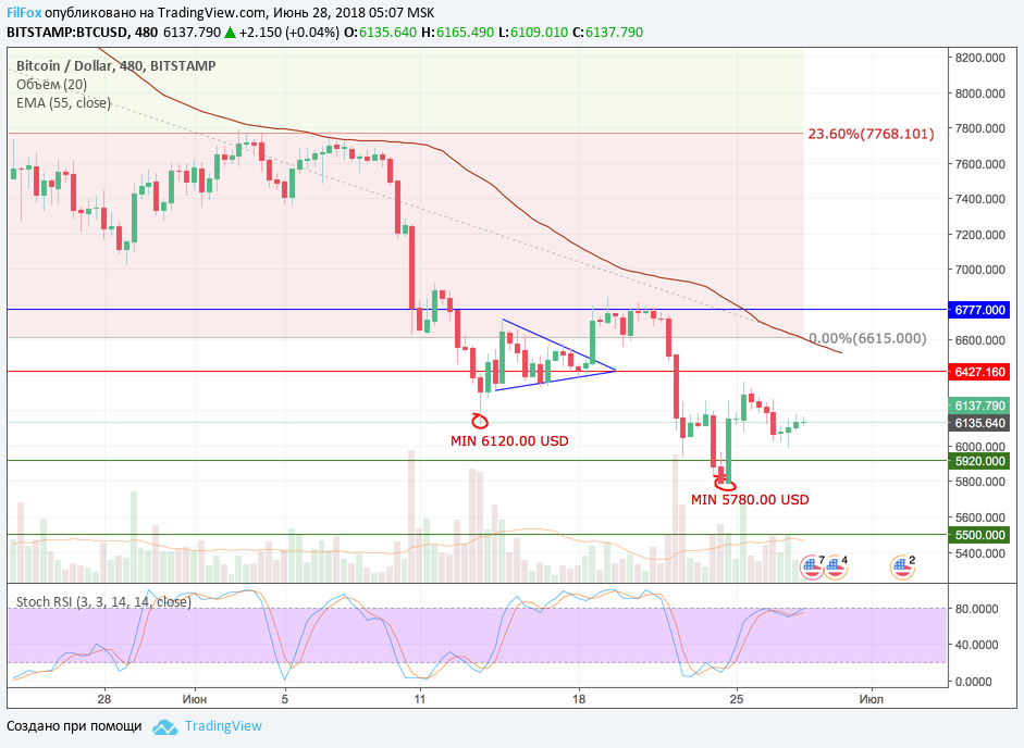 Вчерашняя динамика восстановления пары выглядит очень слабой. В попытке дотянуться до предполагаемого уровня коррекции, на восьмичасовом графике, мы видим, как за весь день, цена нарисовала три зелёные свечи. Дневной минимум зафиксирован в точке 5985.00 USD. Четвёртая, сегодняшняя свеча, выглядит совсем не убедительно и на данных объёмах скорее всего закроется ниже уровня открытия.