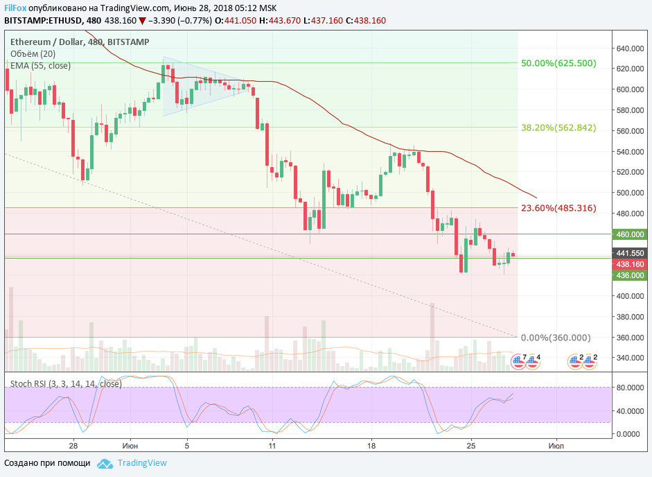 Восстановительная динамика Ethereum, тоже, выглядела вчера довольно бледно. Пара с трудом смогла закрепиться выше уровня 436.00 USD, установив максимум на отметке 446.66 USD. Сейчас цена вновь снижается к поддержке 436.00 USD, по видимому, вступая в фазу консолидации возле этого уровня поддержки. Полагаем, что в скором времени, боковик закончится снижением к психологической отметке 400.00 USD.