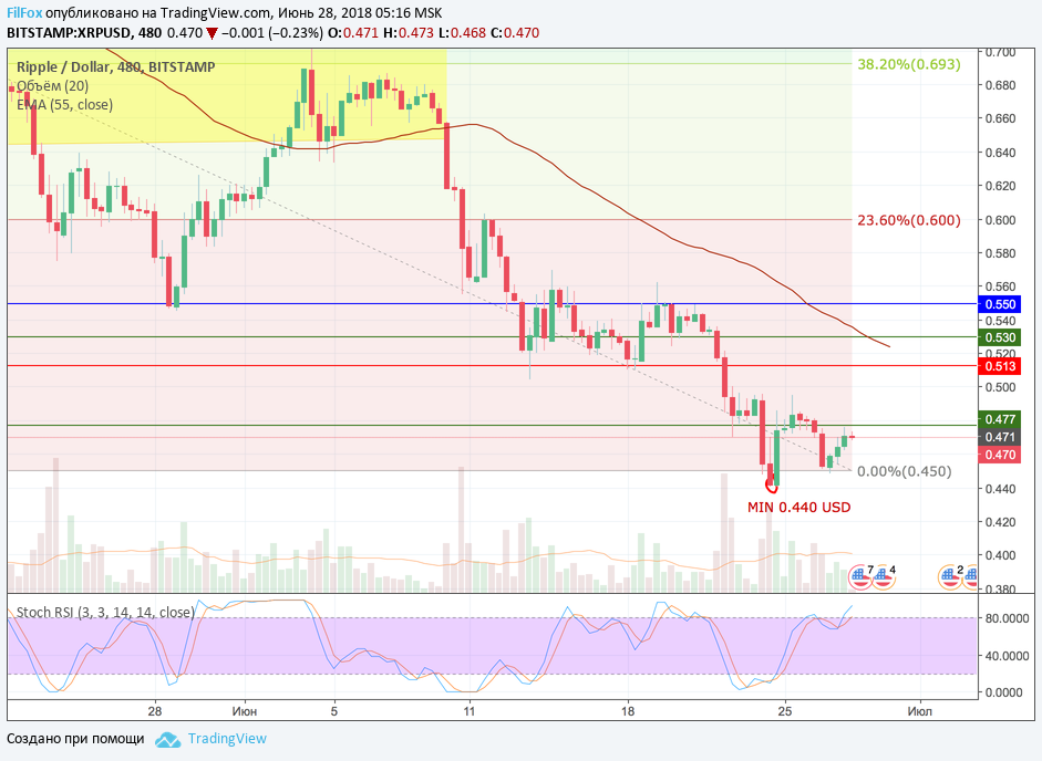 После того, как пара протестировала нулевой уровень поддержки фибоначи (0.450 USD), цена начала восстанавливаться. Но в течении вчерашнего дня смогла достигнуть только уровня сопротивления 0.477 USD. На данный момент Ripple переходит от восстановления к консолидации. Полагаем, что боковой диапазон не продлится долго и будет проходить между нулевым уровнем поддержки (0.450 USD) и сопротивлением 0.477 USD. Выход из боковика, скорее всего, будет в продолжении даун-тренда и ближайшая целевая точка находится в области $0.42 - $0.40