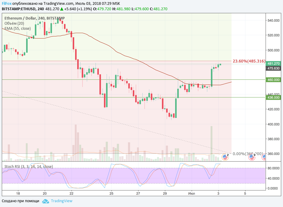 Вчера цена Ethereum смогла пробить сопротивление скользящей средней EMA55 и вырваться за пределы верхней границы коридора, находящейся на уровне 460.00 USD. Сейчас быки борются за уровень фибоначчи 23.6% (485.31 USD). Закрепление выше этого уровня, позволит перейти к штурму ключевого уровня 540.00 USD, который является воротами восходящего тренда.